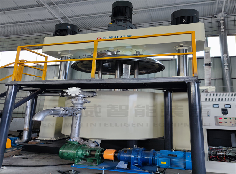 2.半自動線生產(chǎn):計量斗、稱重和輸送系統(tǒng)、儲罐、5000L分散機預(yù)混基料、自動投粉、烤箱烘干、3000L、2000L、1100L行星、動混、強分進行制膠,配套真空、冷卻裝置,完成分散、混合、真空工序,進行生產(chǎn)。此工藝產(chǎn)量穩(wěn)定,適合中大規(guī)模投產(chǎn)。